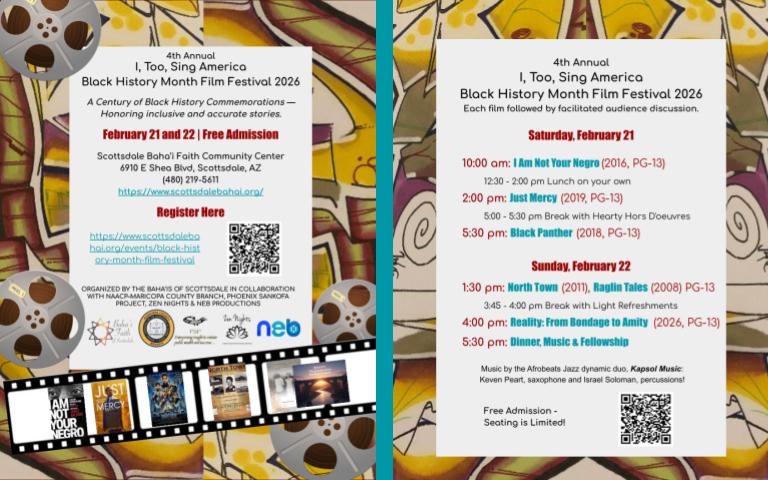Now in its 4th year, I, Too, Sing America is a film festival exploring the African American experience through the art of cinema. Building on more than a decade of community-based programming by the Bahá’ís of Scottsdale in partnership with the NAACP-Maricopa County Branch and other community partners, the festival creates a shared space for reflection, dialogue, and connection across difference. In a time when we often watch films in isolation, this festival brings people together for meaningful conversations that move us toward a more just, inclusive, and unified community.